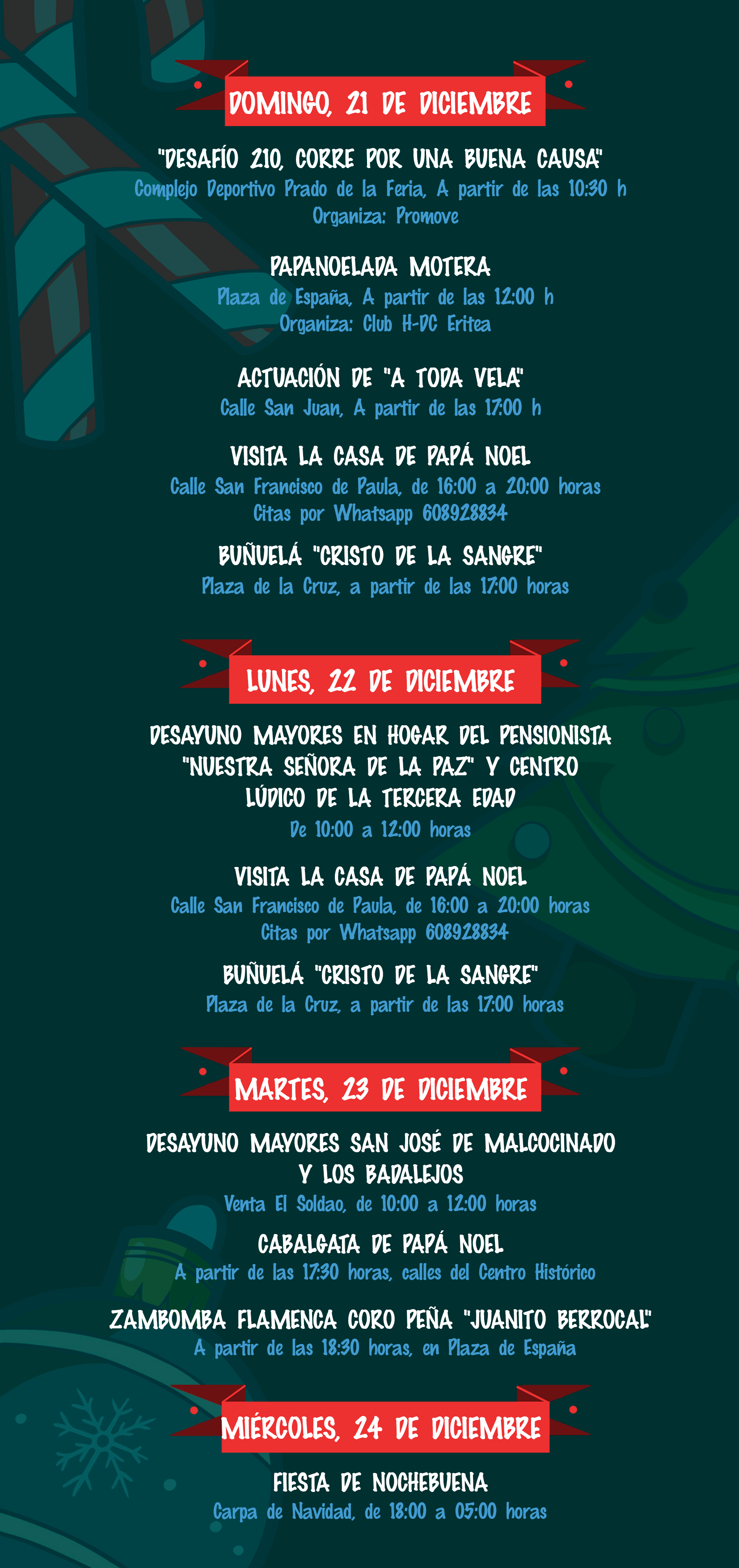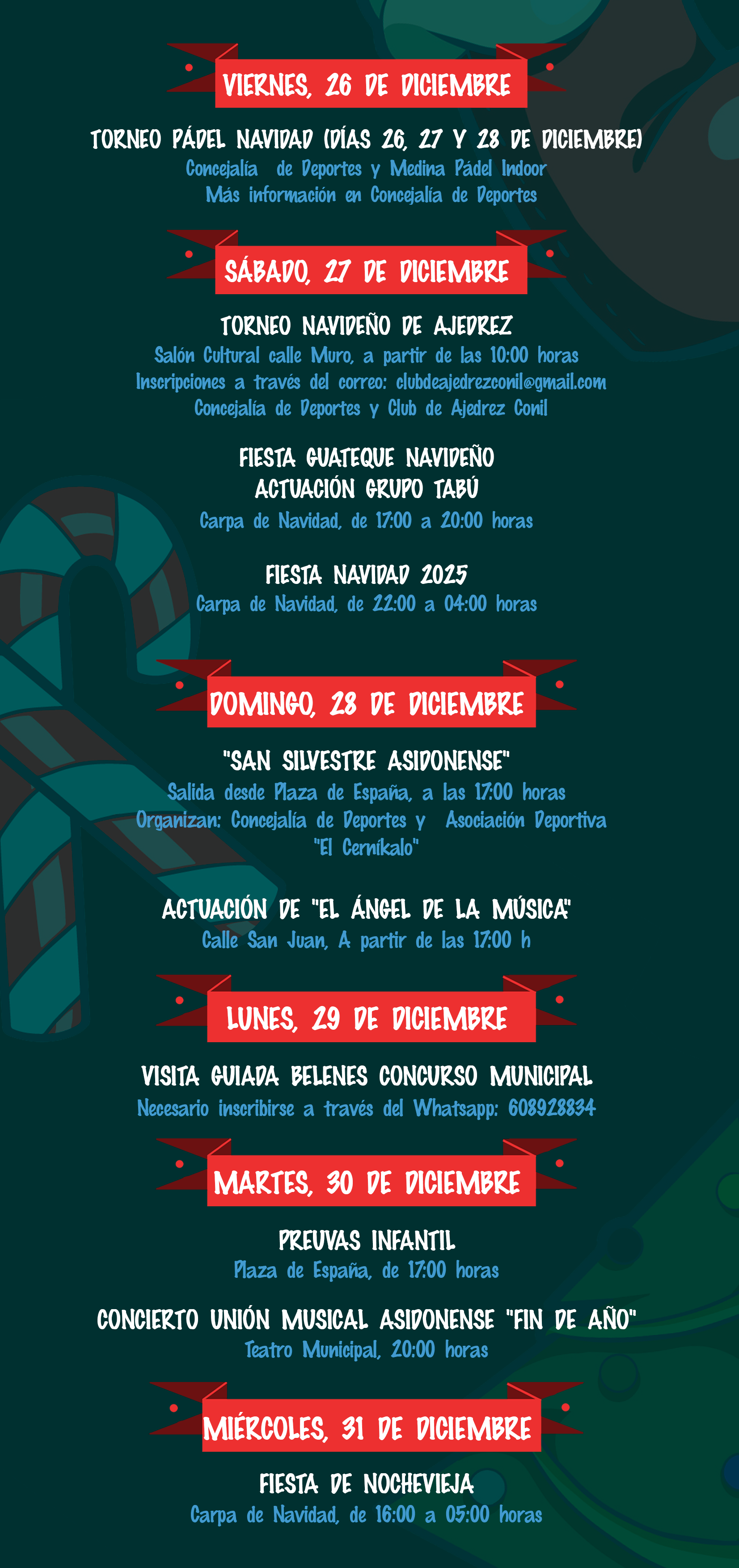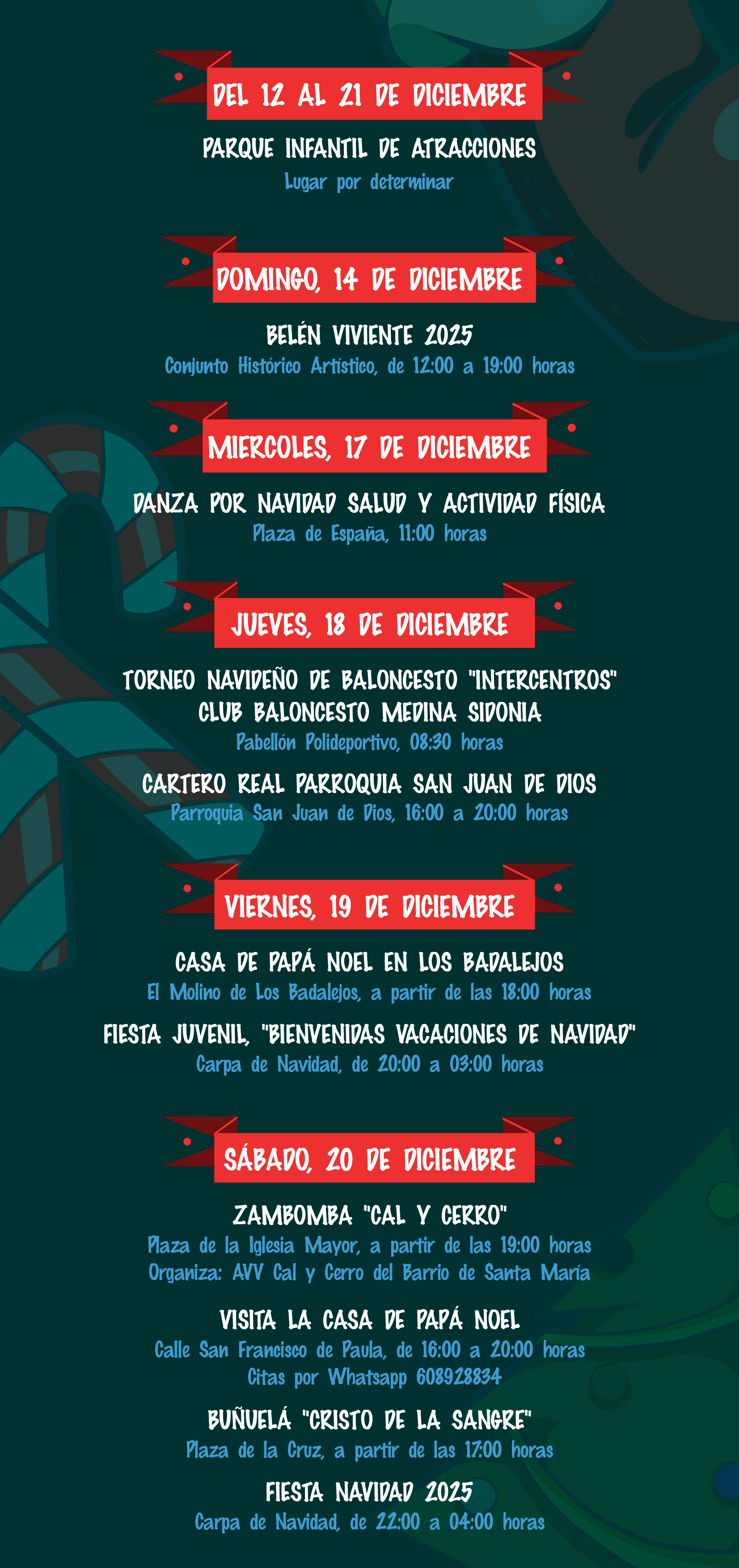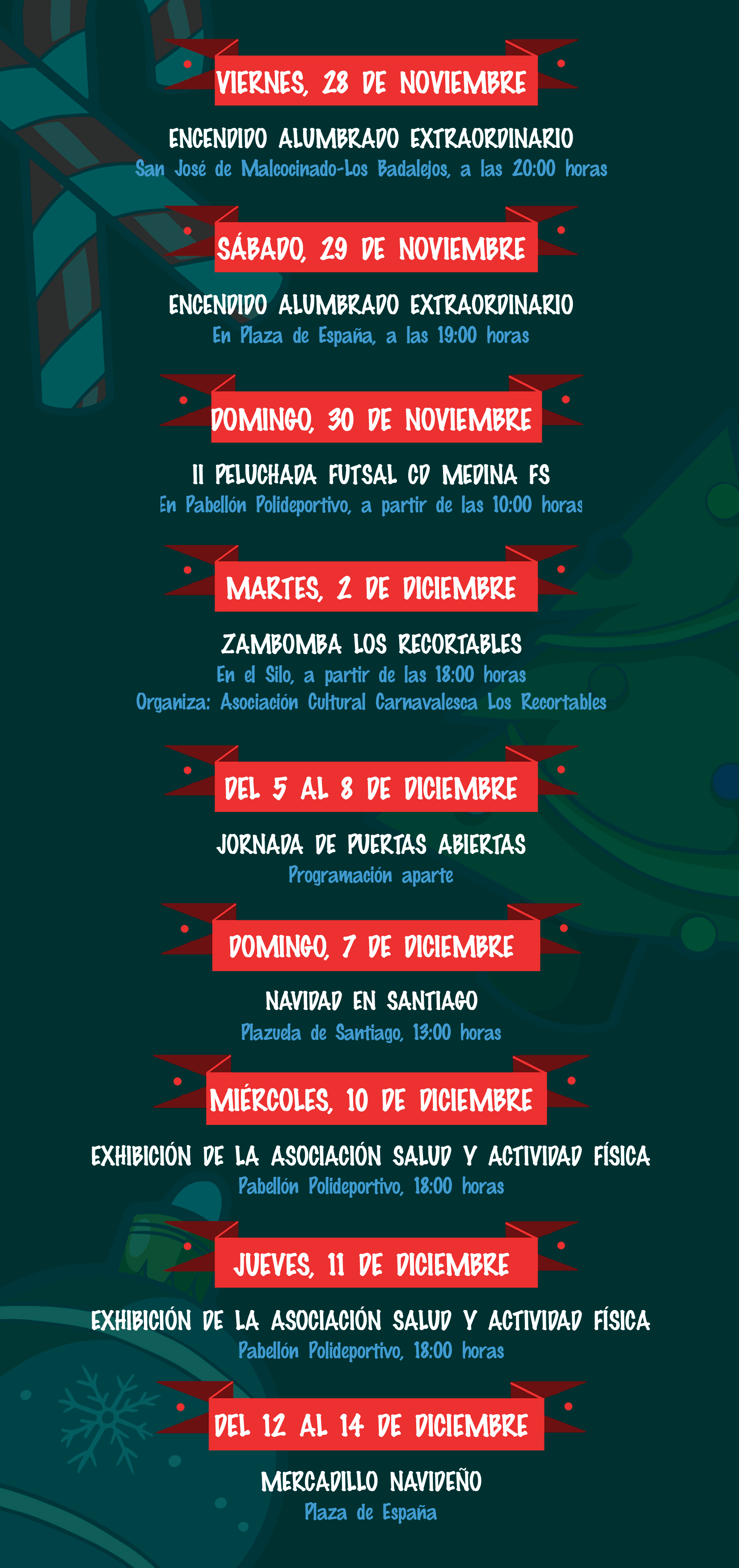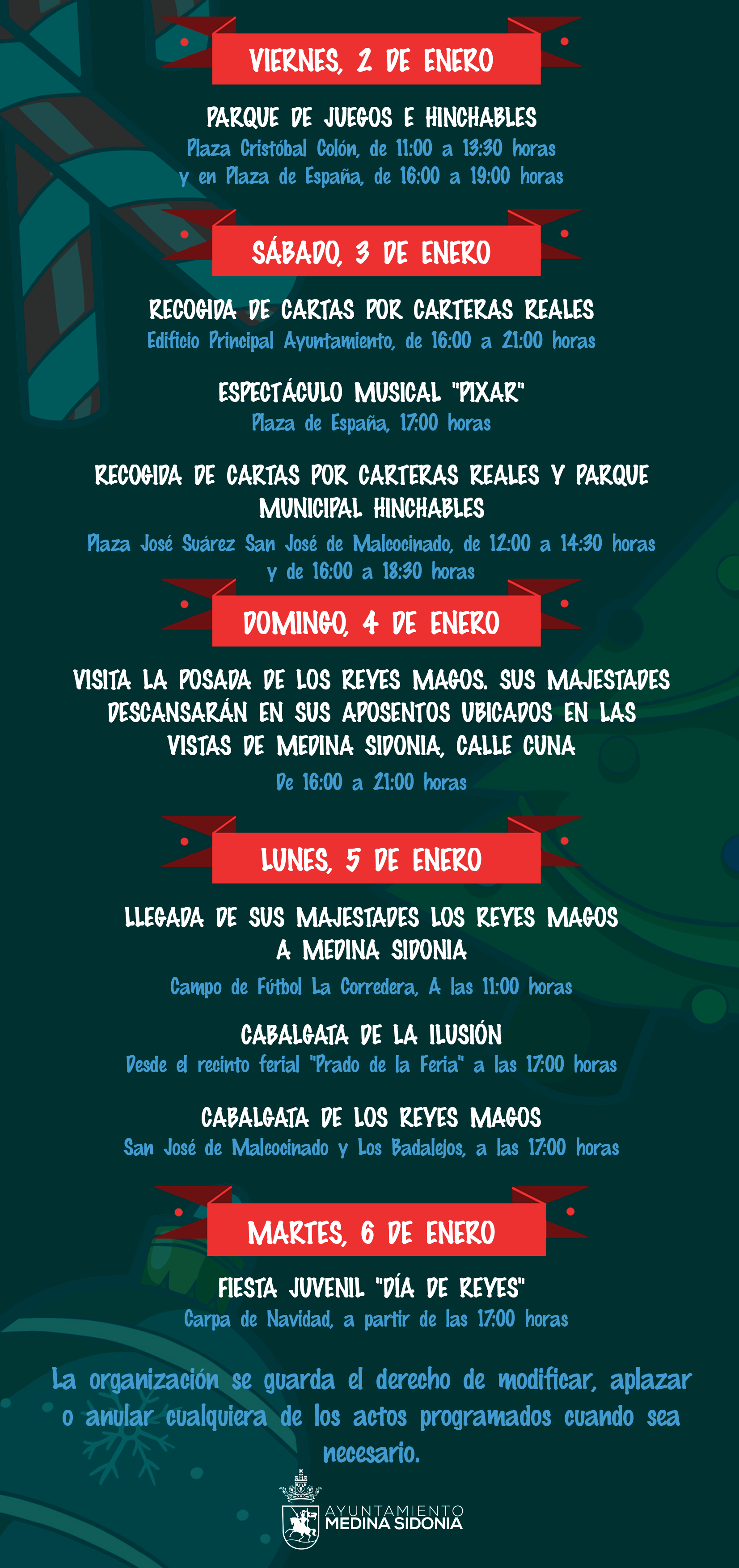 La Concejalía de Fiestas del Ayuntamiento de Medina Sidonia ha dado a conocer la agenda de actividades preparadas para las próximas fiestas de Naviadad y Reyes Magos.